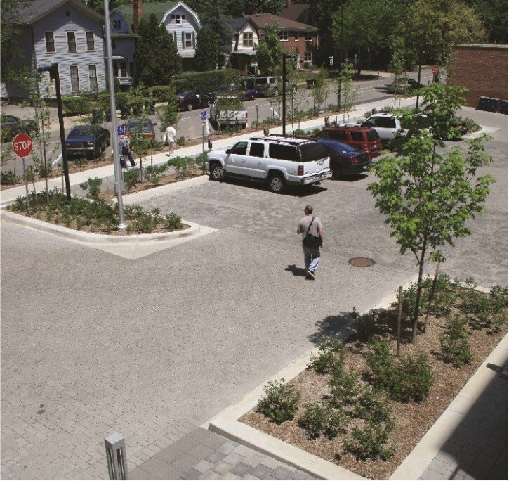 - The vehicular parking area on the north side of the site is surfaced with 12,326 sf of interlocking concrete permeable paving units. A granular subbase under the pavement is used as temporary storage for infiltration and detention of stormwater from the north half of the Larcom Building.