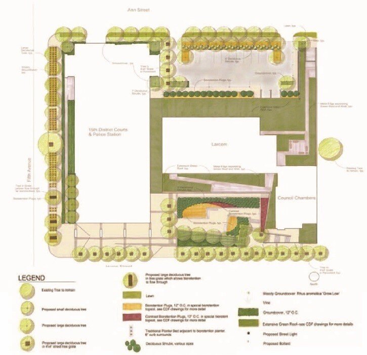 - The site offers seasonal public access to a green roof promenade and picnic tables above the first level of the Larcom Building. The green roof features over 5,000 vegetated trays (two square feet each), each planted with a variety of sedum, scattered with alium (wild onion) for color and height. The trays cover 10,318 sf and provide 3,436 cubic ft of soil volume, thus helping to retain water and reduce the potential for the roof surface to heat up.