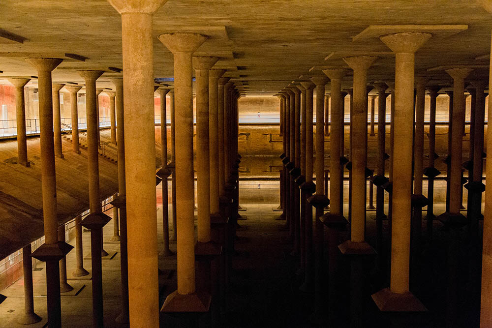 - Water Works, a massive 87,500-sf underground installation art venue, reuses and reimagines a historic City water storage facility called the Cistern. The roof of the Cistern hosts the Downtown Skyline Pavilion and the Sky Lawn and Performance Stage, which include a flexible performance lawn, multi-use plaza, visitor center, restroom facilities, and bike rentals. A large lawn at Eleanor Tinsley Park provides space for seasonal events such as concerts and festivals.