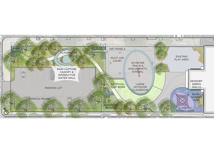 - Parking was consolidated and reoriented to the south side of the site, creating an additional 2,613 sf of usable play/learning/green space. This design move also allowed for a new entrance to be created; the curvilinear path connects the two ends of the schoolyard site which were previously fenced off. Approximately 1/3 of the parking lot is porous asphalt paving and a 120-ft-long x 24-ft-wide x 4-ft-deep underground storage reservoir beneath, with capacity for a 1-in storm.