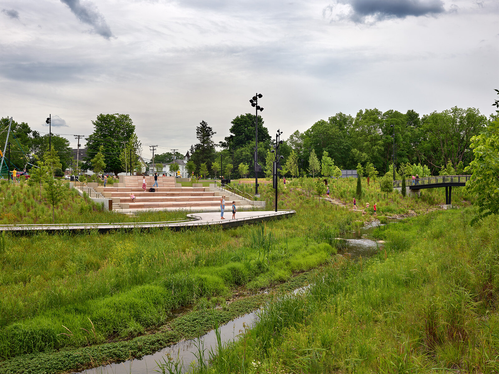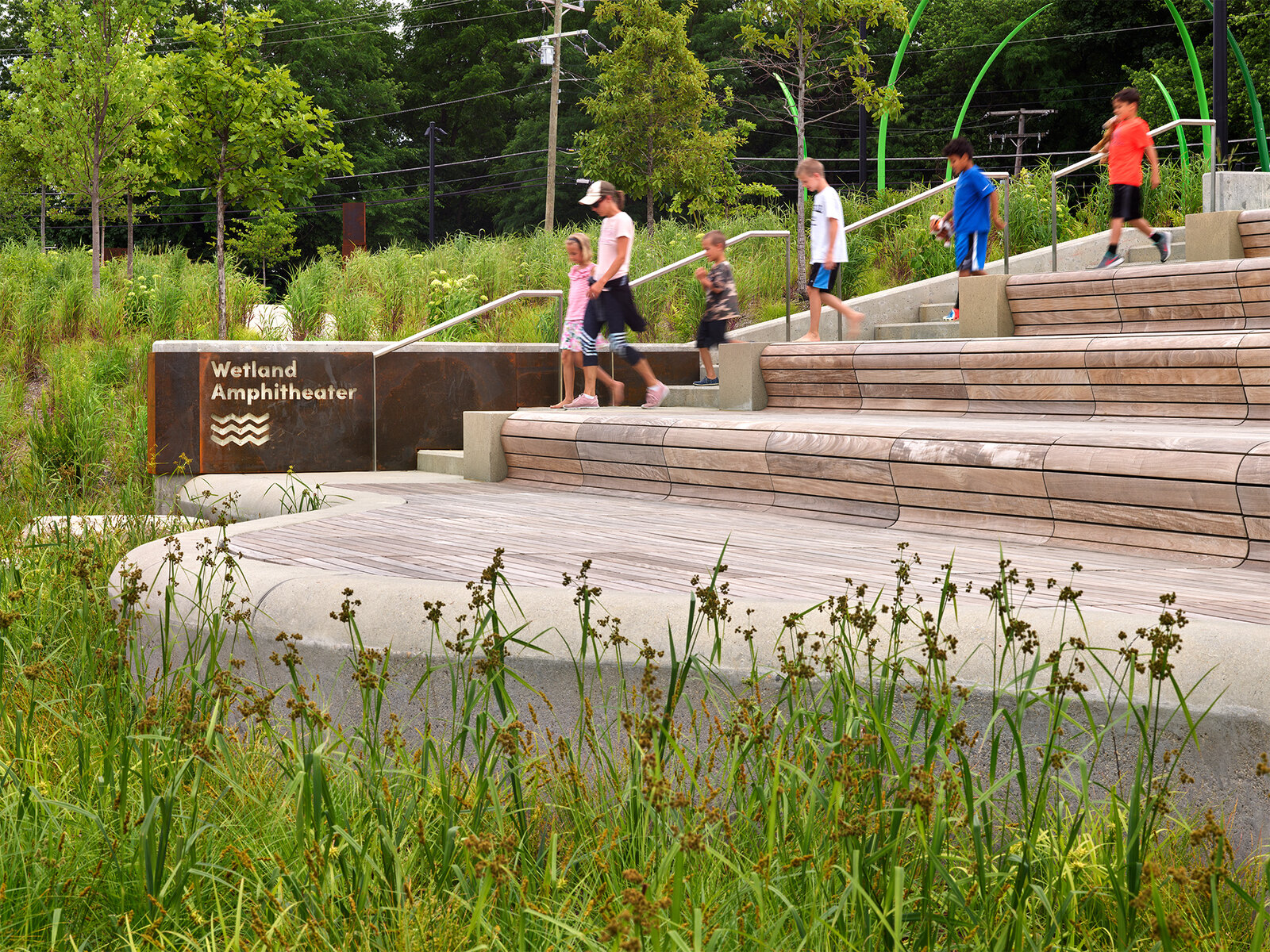 - A wetland amphitheater symbolically represents the cascade of water over tiers and can withstand inundation from flood events. An elevated walk separated by riparian planting serves as an extending stage for small performances, gatherings, and passive seating.