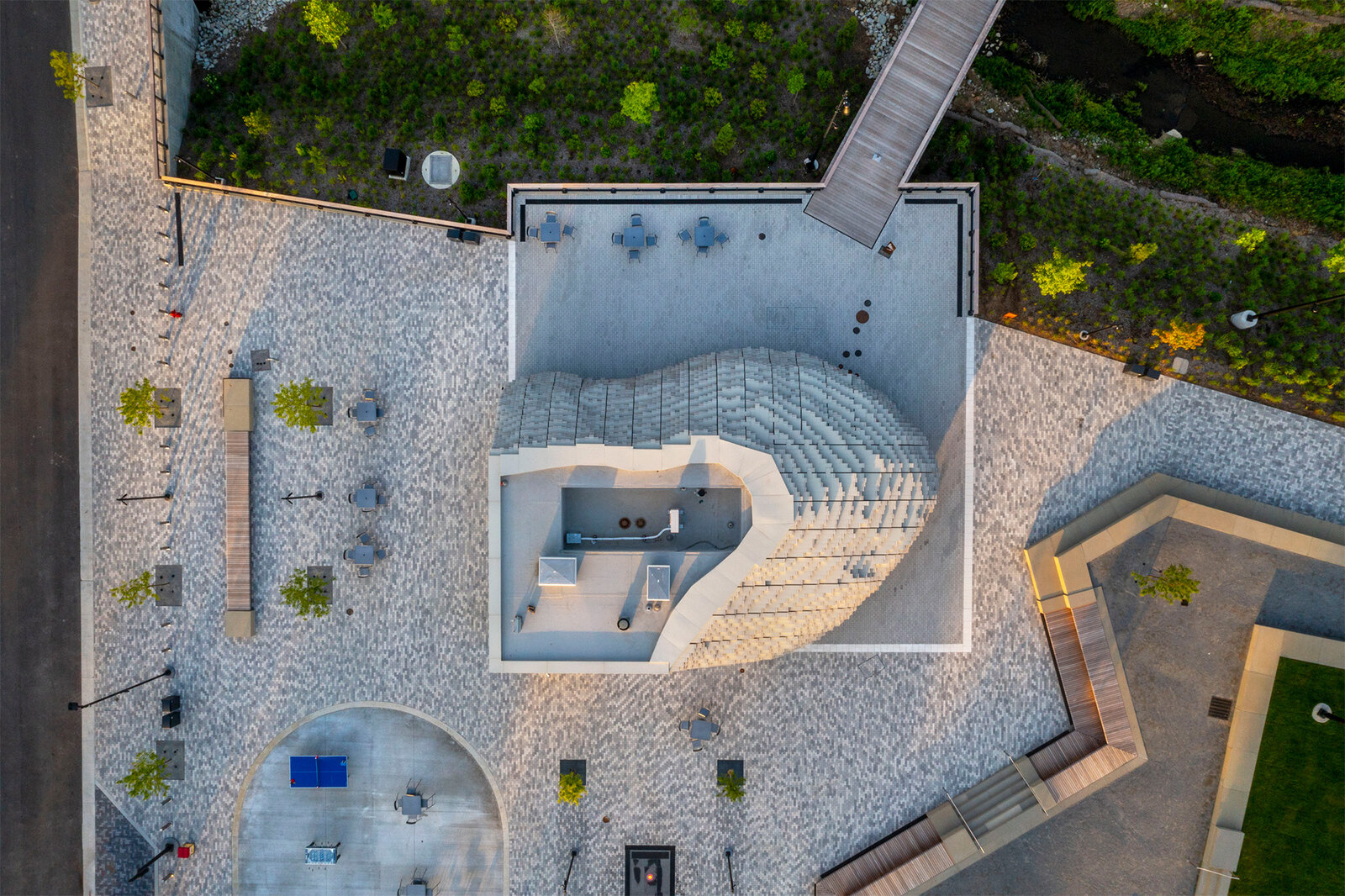 - Some design decisions were affected by changes in project scope. For example, the original grading and materiality of the plaza where the ice rink is located were designed to support the refrigerant requirements of the ice rink. When the integrated refrigeration was removed from the project scope, alternate paving material could have been selected as concrete was no longer necessary.