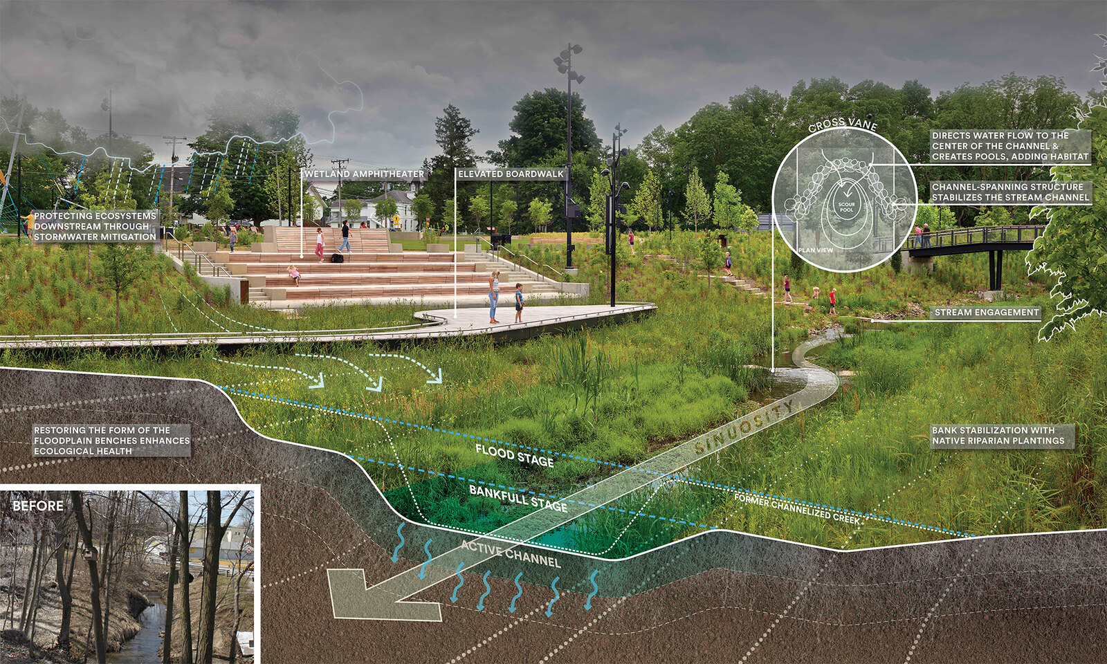 The landscape architect was the Design Lead for this project, facilitating coordination between 15+ consultants as well as presentation to and engagement with the client and local community. Services spanned from early site investigation and preliminary concepts through Construction Documents and Construction Administration and ultimately, post-occupancy evaluation. The landscape architecture team collaborated closely with the broader team to create high-performing public infrastructure in a uniquely sensitive riparian corridor.