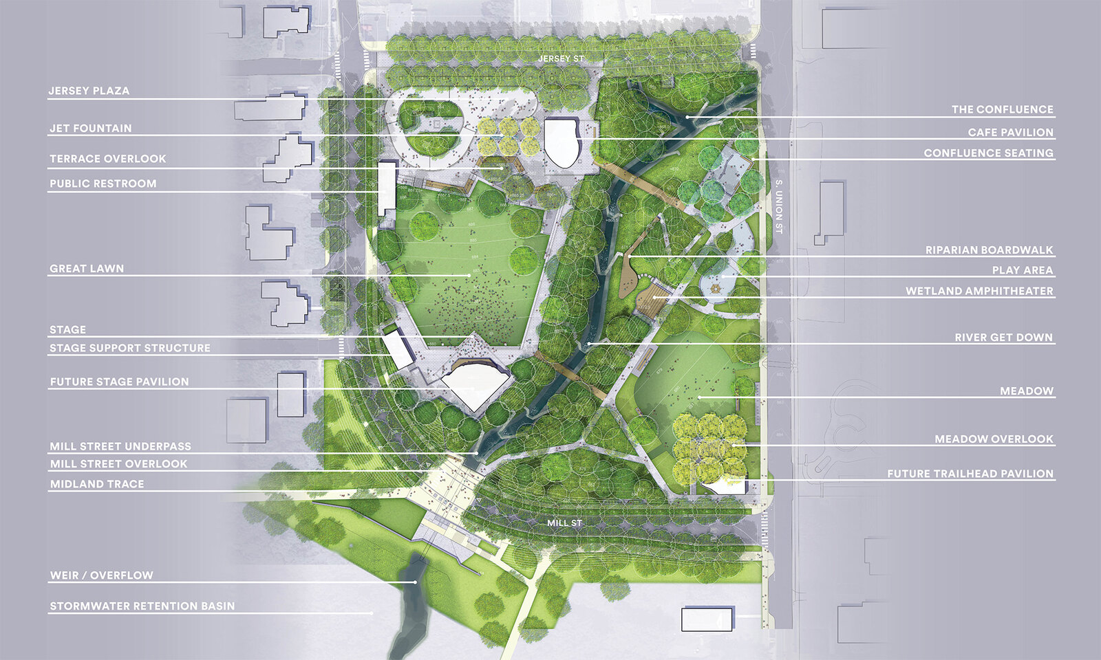 - As part of the redevelopment, a 500-ft section of Park Street that previously ran through the middle of the site was removed, while Mill Street was extended to the south end. This allowed for a smoother connection of the Midland Trace Trail across the west and east ends of the park, linking the surrounding community along a 6-mile stretch.