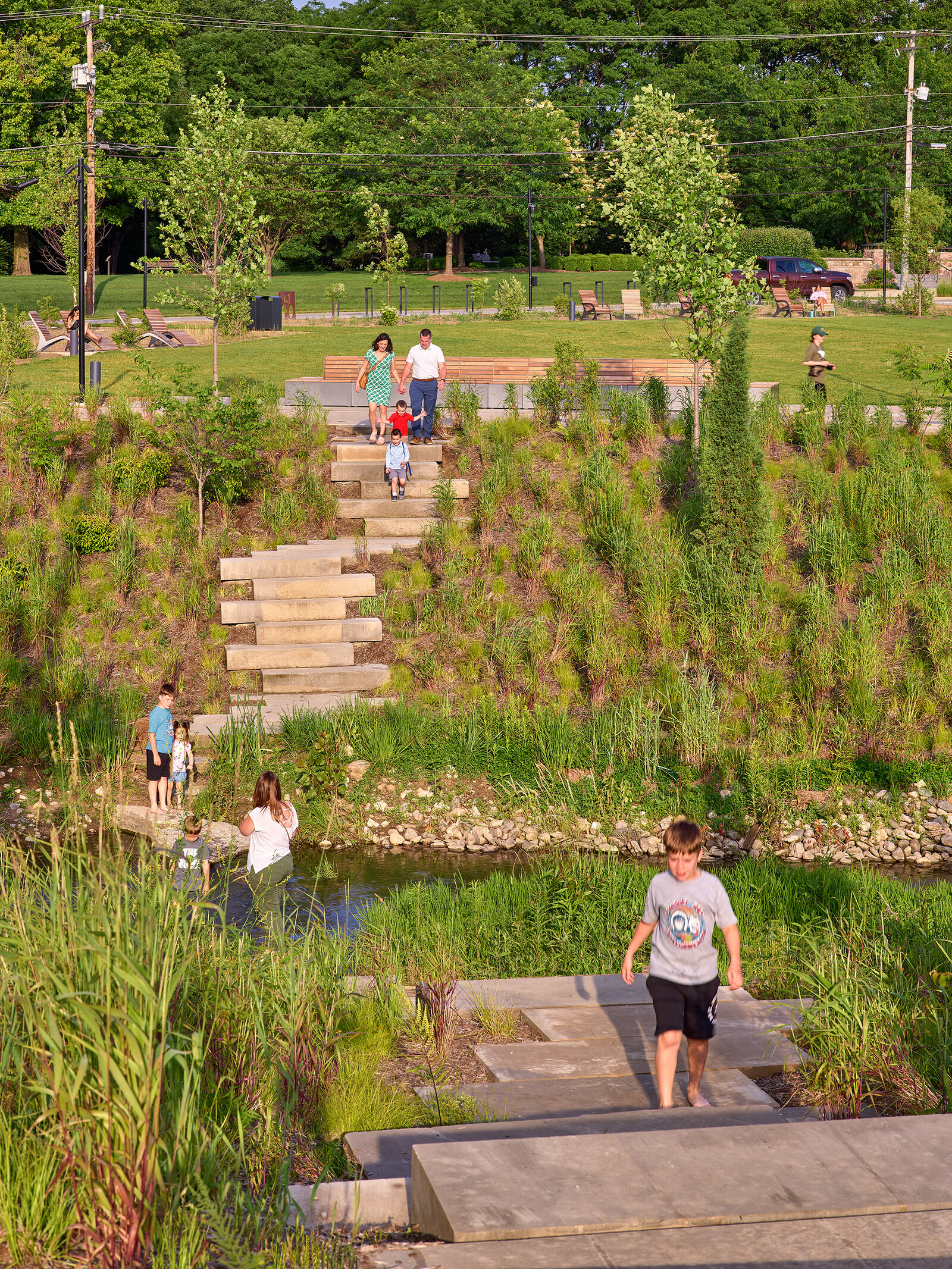 Grand Junction Park and Plaza is a 6-acre civic space located in Westfield, Indiana — a northern suburb of Indianapolis with a population of 58,410 as of 2023. Strategically situated at the convergence of five trails along the Grassy Branch of Cool Creek, Grand Junction serves as a central gathering place for residents and visitors alike and was created with a focus on environmental resilience and community engagement. Before its redevelopment, the site was a flood-prone area with underutilized open spaces and structures, fragmented green spaces, and a channelized, eroded creek. The design process set out to envision a civic park for citizens to gather, but that vision was expanded by necessity after a 500-year storm event during the design process revealed the urgency of flood mitigation. Cool Creek, which divides the park, was stabilized to prevent future flooding while maintaining its natural beauty. The park now blends stormwater infrastructure with social amenities and serves as a vibrant, pedestrian-friendly town center, connecting nearby schools, the public library, healthcare facilities, a growing commercial district, and surrounding neighborhoods within a one-mile radius, enhancing accessibility and fostering a thriving, inclusive community.