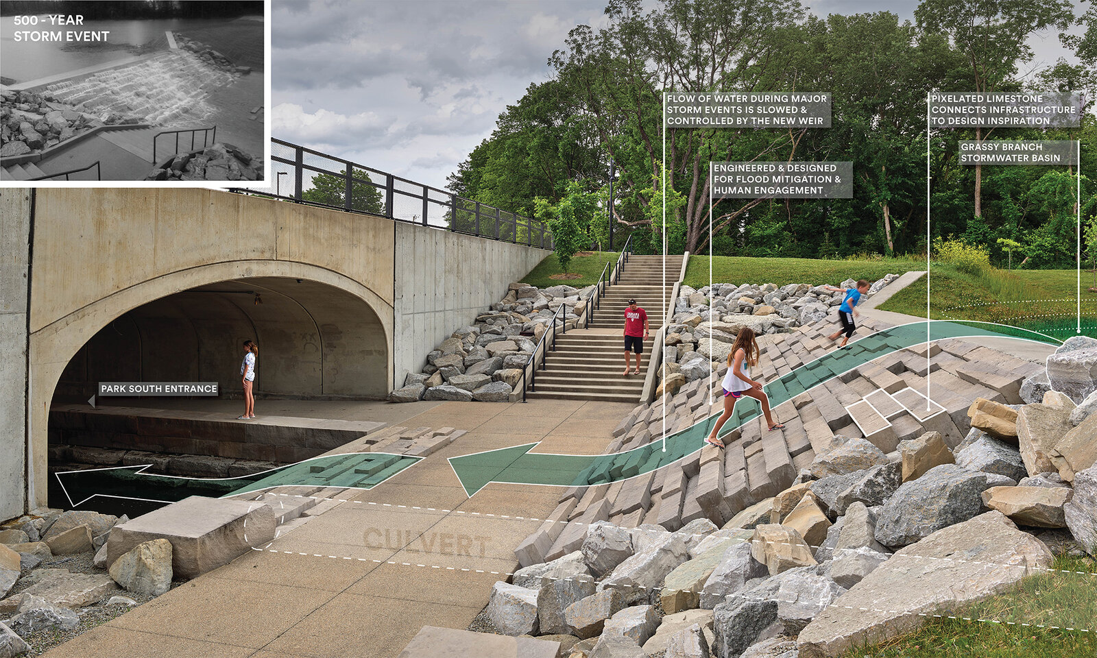 - An engineered weir system constructed of limestone blocks functions as both an interactive feature and a stormwater management tool that is designed to slow and control water flow during heavy rain events.