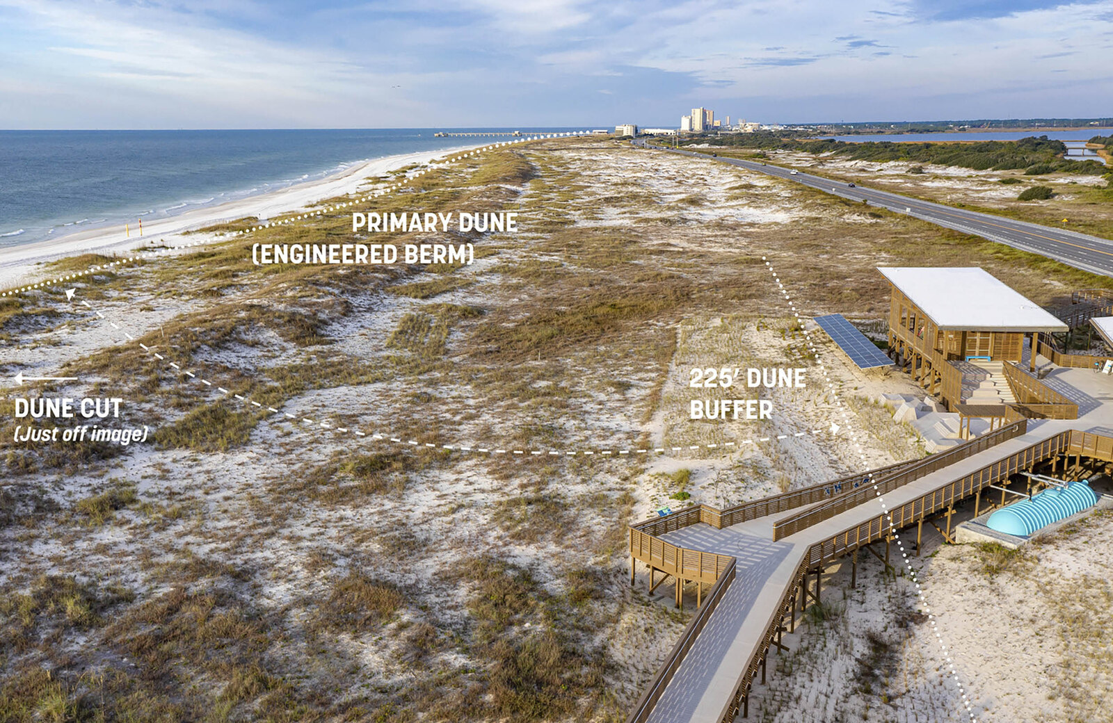 - The restored dune system has proven to be resilient. In 2016, cuts were strategically created through the existing waterfront berm to encourage the growth of secondary and tertiary dunes. Hurricane Sally, a Category 2 hurricane with maximum sustained winds of 105 mph, produced widespread wind, storm surge, and freshwater flooding across coastal Alabama. When Sally tested Gulf State Park’s dune system on September 16, 2020, the dune system held, and there was little damage to The Lodge. Through tests like these, the park demonstrates how nature-based techniques like dune restoration can work with resilient building design to create a multilayered approach to hurricane and flood protection.