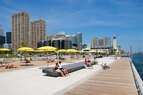 - The water’s edge is composed of 2 iconic elements; a “beach” of fine white sand, and 38 custom-made vibrant yellow all-season umbrellas.